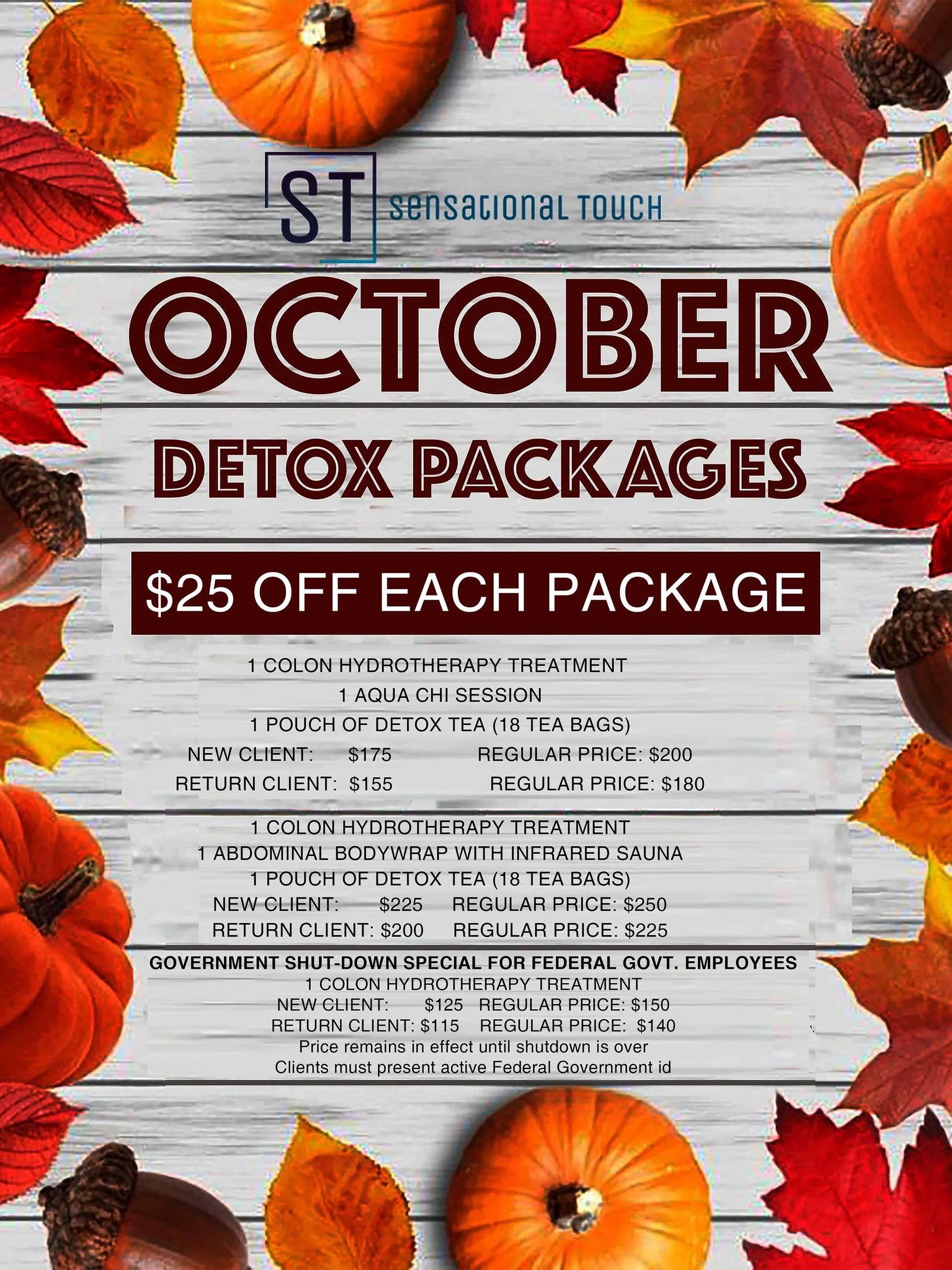 $25 Off Detox Packages in October. Colonic & Aqua Chi OR Colonic & Ab Bodywrap. Federal Government Employees & Contractors Special available for a single Colonic or a Series of 3 Colonics.