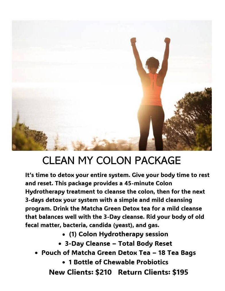 It's time to clean and detox your system thoroughly with a Colonic, 3-Day Cleanse to be used after the Colonic (at home), Matcha Green Tea, and a bottle of probiotics. This is a great start to cleaning your inside for overall health and wellness.